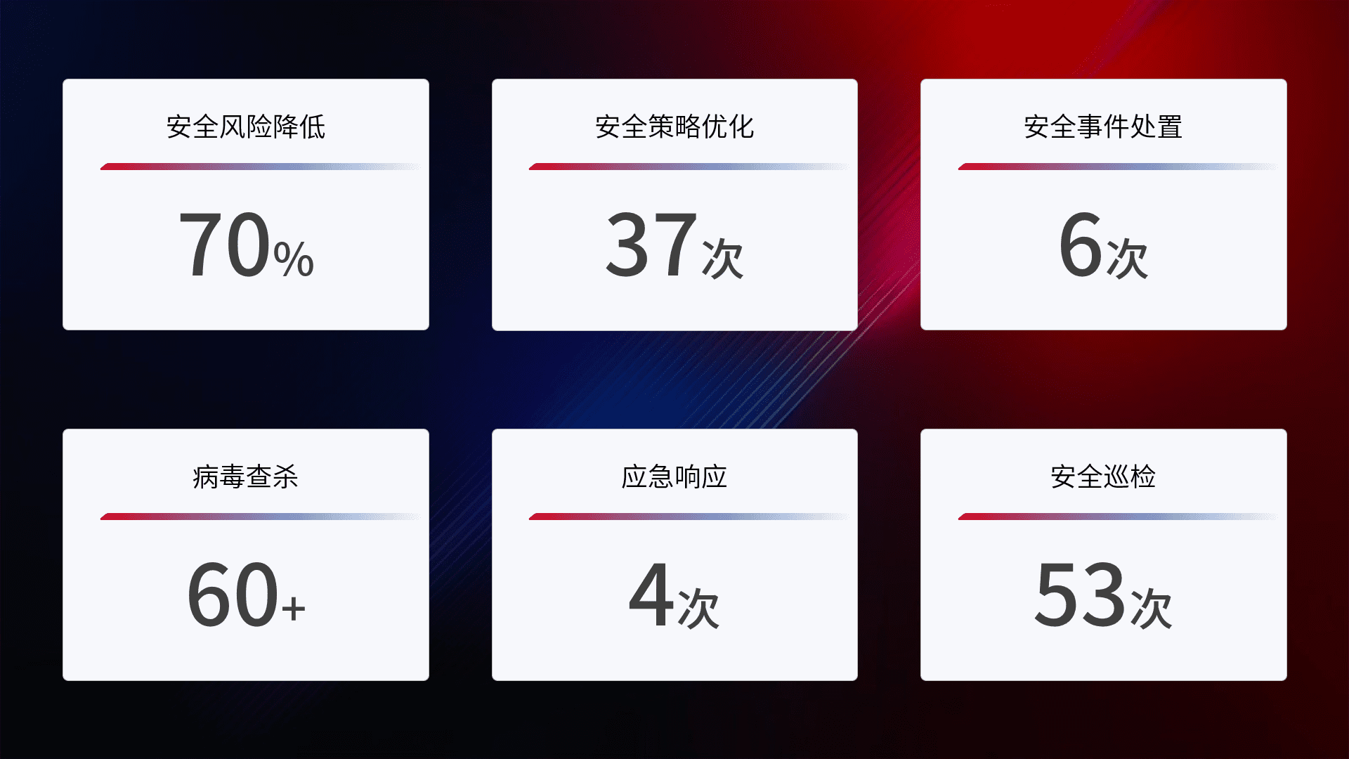 提供全面的安全事件报告体系,,,,包括处置报告、、周报、、、、季度和年度总结,,结合持续监控,,帮助客户深入了解网络安全状况。。。